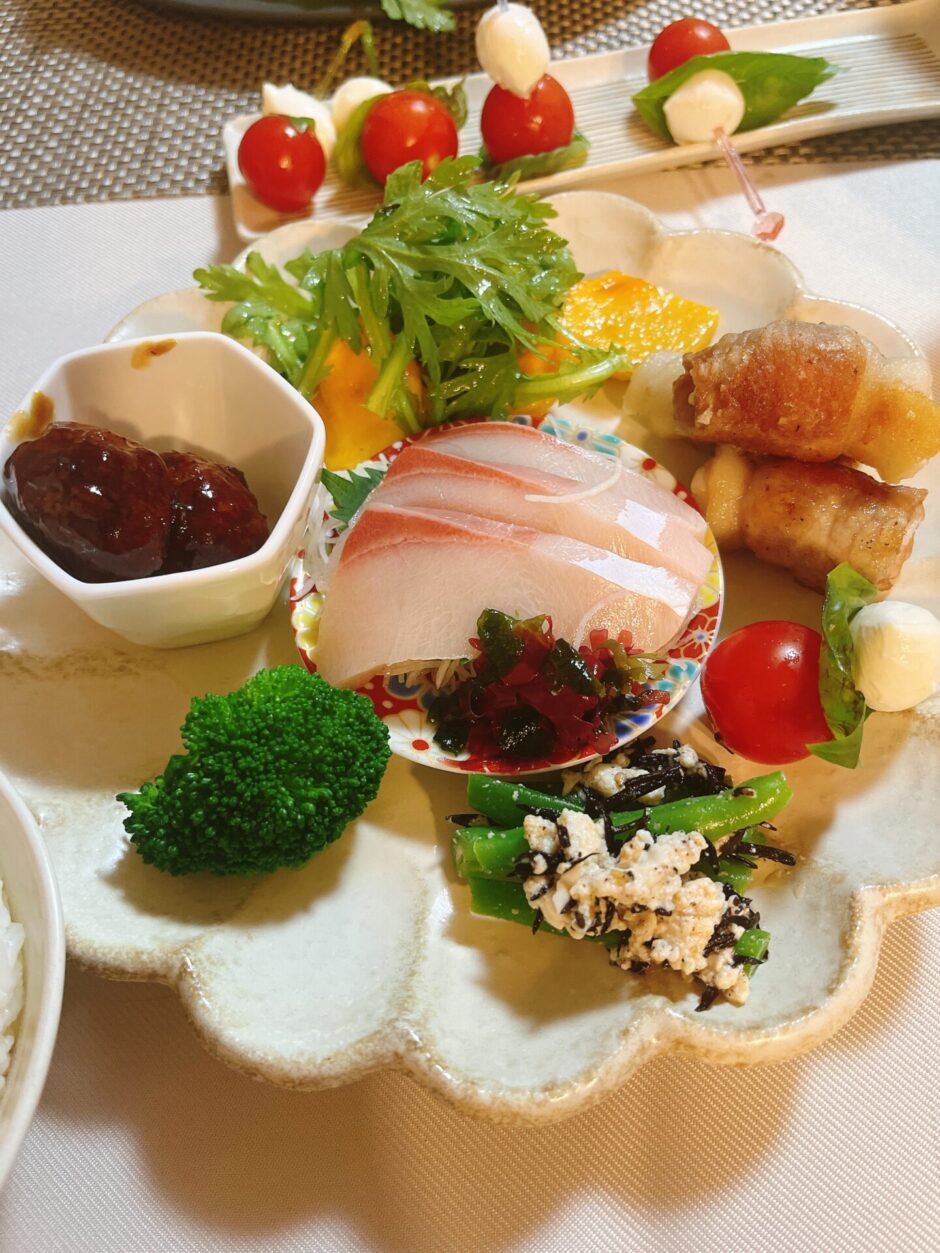 上から柿と春菊のサラダ、白ねぎの肉巻き、ミニトマトとバジルのカプレーゼ風ピンチョス、インゲンとひじきの白和え、