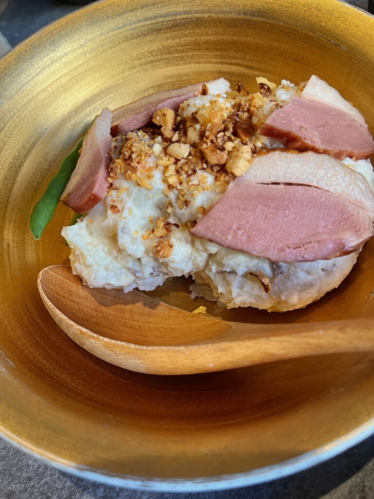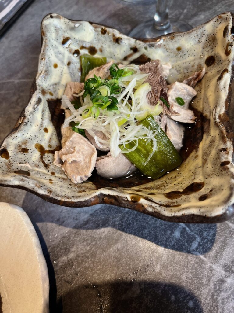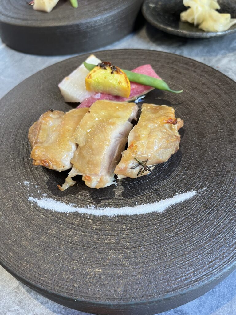 鶏肉も出てきました。高さのある器、カラフルな野菜、塩の置き方、映えますね。