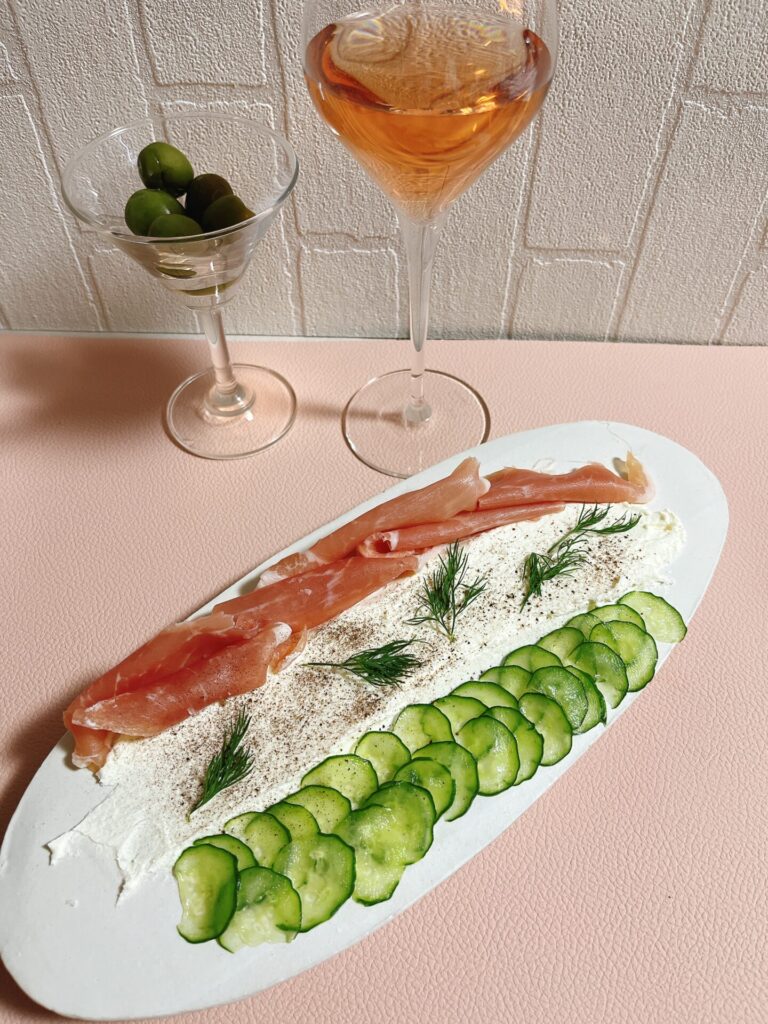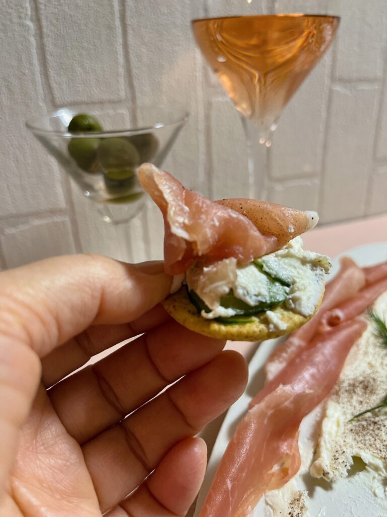 クリームチーズに塩揉みしたきゅうりと生ハムをクラッカーにのせるそれだけで食欲そそるオードブルになります