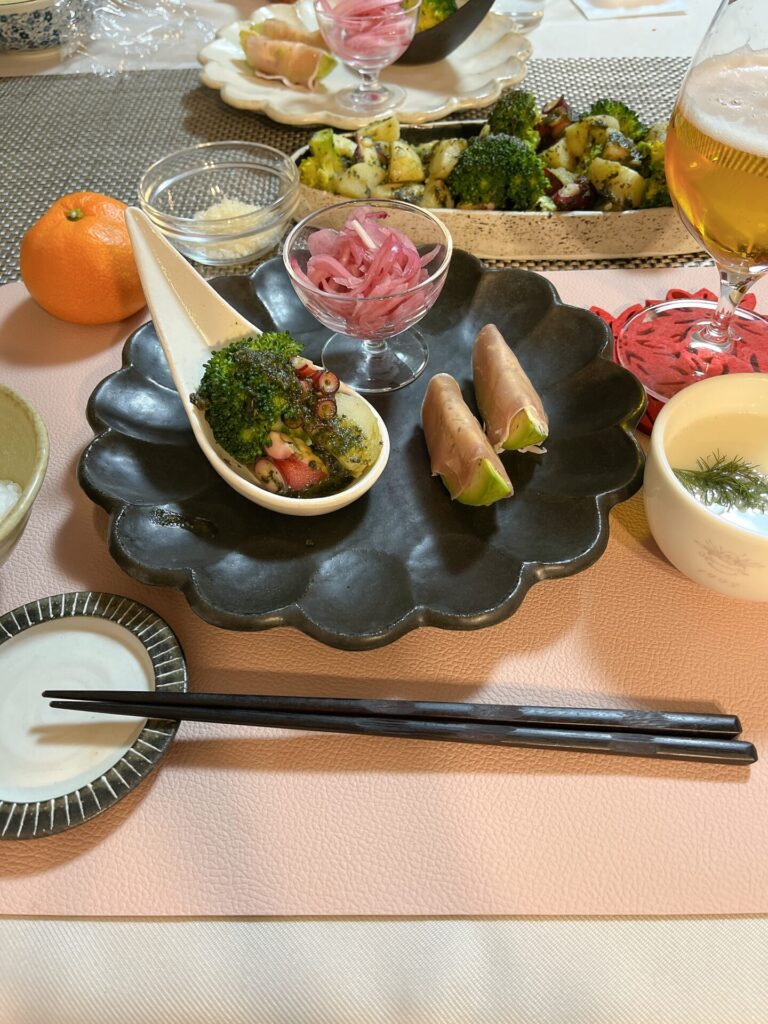 ・ブロッコリーとタコとしゃがいもを茹でてバジルペーストで和える。