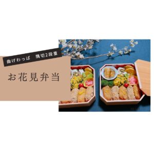 お花見弁当(しゃけの菜種焼き風、白ネギとエリンギの肉巻き)曲げわっぱ隅切2段重に盛りつけます